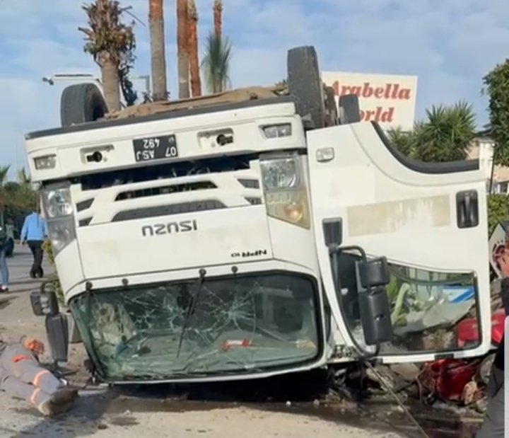 Antalya’nın Alanya İlçesi Avsallar Mahallesinde Alanya Belediyesine ait çöp toplama kamyonu ile sürücü H.Ö idaresindeki çöp toplama kamyonu ile Manavgat’a seyir halinde giden G.D.Y idaresindeki kamyonun arkadan çarpması neticesi çöp kamyonun savrulmasıyla yol dışına çıktı, park halinde bulunan üç tekerlekli elektrikli motosiklete de çarptıktan sonra devrildi, kazada bir işçi asfalta savruldu. Çöp kamyonun ters dönmesiyle çöp kamyonu sürücüsü H.Ö ve aynı araçta bulunan temizlik personeli M.G ve H.U yaralandılar.