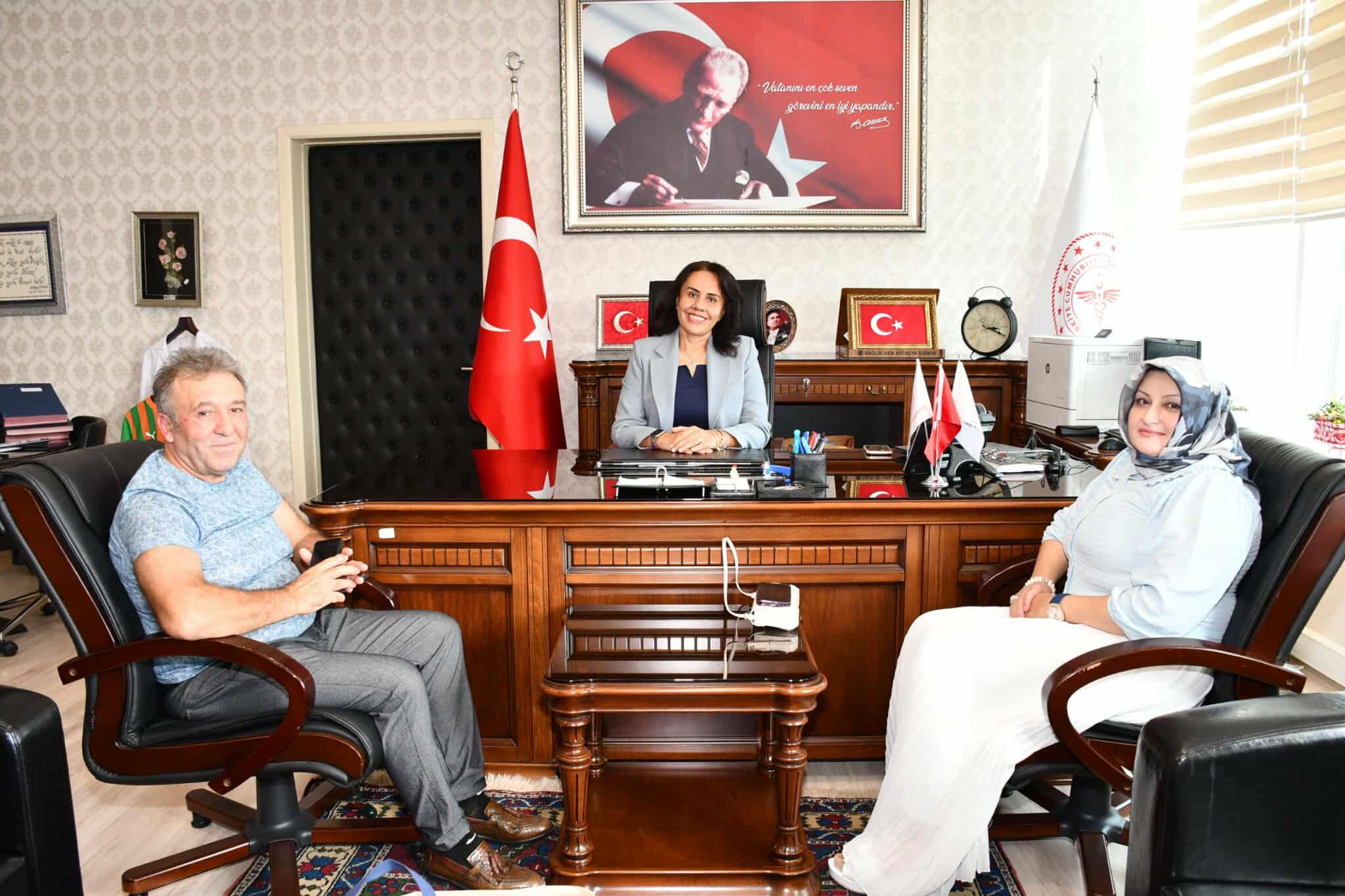 Alanya Güneşi Medya İmtiyaz sahibi ve genel yayın yönetmeni İbrahim Akdağ ve medyanın haber müdüreliğini yapan Ayten Yılmaz bugün Başhekim Prof. Dr. Banu Karakuş Yılmaz'a hayırlı olsun ziyaretinde bulundular.