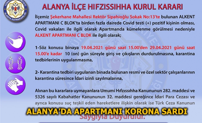“İlçemiz Şekerhane Mahallesi, Rektör Sipahioğlu Sokak, No: 13’te bulunan Alkent Apartmanı C Blok’ta birden fazla dairede Covid testi pozitif kişinin olması, Covid vakaları ile ilgili olarak apartmanda kümelenme görülmesi nedeniyle Alkent Apartmanı C Blok ile ilgili olarak, söz konusu binaya 29 Nisan 2021 Perşembe günü saat 15.00’e kadar 10 gün süreyle giriş ve çıkışların durdurulmasına, karantina tedbirlerinin uygulanmasına, karantina tedbirleri uygulanan binada bulunan resmi ve özel sektör çalışanlarının karantina süresince idari izinli sayılmalarına, alınan bu kararlara uymayanlara Umumi Hıfzısıhha Kanunu’nun 282. maddesi ve 5326 sayılı Kabahatler Kanunu’nun 32. maddesi gereği idari para cezası ve ayrıca konusu suç teşkil eden hareketlere ilişkin olarak ise Türk Ceza Kanunu’nun 195. maddesi gereğince işlem uygulanmasına karar verilmiştir.”