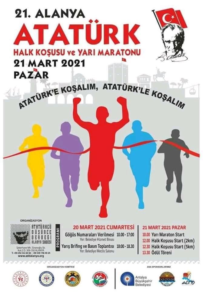 Alanya Kaymakamlığı, Alanya Belediyesi, Türkiye Atletizm Federasyonu ve Atatürkçü Düşünce Derneği Alanya Şubesi öncülüğünde 21. Alanya Atatürk Alanya Halk Koşusu ve Yarı Maratonu 21 Mart Pazar günü Alanya Anıt önünde yapılacak.