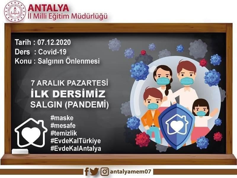 Antalya ve ilçelerinde uzaktan eğitim yarın başlıyor. Antalya İl Milli Eğitim Müdürü Hüseyin Er, uzaktan eğitimle ilgili yaptığı açıklamada ilk ders konusunun pandemi olacağını belirterek; "Antalya'da tüm okullarımızda uzaktan eğitimde 07/12/2020 Pazartesi (yarın) ilk dersimiz salgın (pandemi). Eğitim camiası olarak öğretmenlerimizle velilerimizi ve öğrencilerimizi daha da bilinçlendire bilmek için bir farkındalık oluşturmak istedik." dedi.