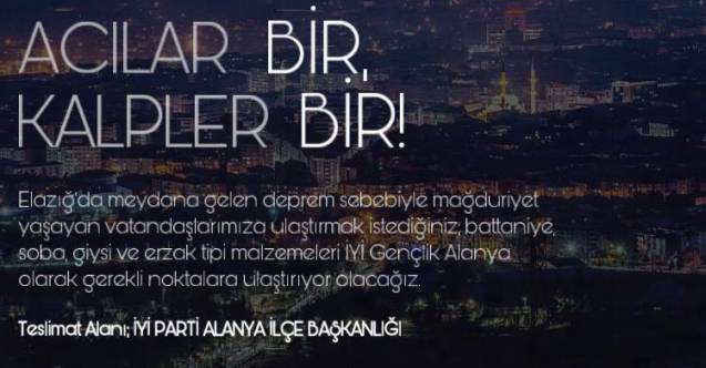 Alanya İYİ Parti ilçe Teşkilatı dün Elazığ'da yaşanan deprem felaketinin ardından Elazığ ve çevre illerdeki afetzedelere yardım kampanyası başlattı...