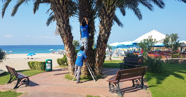 Ziraat mühendisleri eşliğinde, Alanya'da ve Antalya merkez dahil sorumluluk alanı içinde bulunan hurma ve palmiye ağaçlarının tespitini yapan Park ve Bahçeler Şube Müdürlüğü ekipleri bakım ve ilaçlama çalışması gerçekleştiriyor.