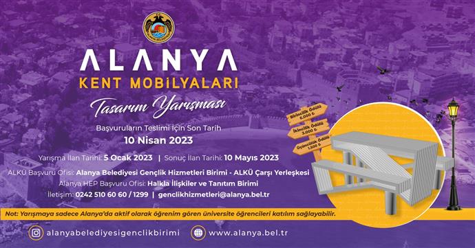 Alanya Belediyesi, Alanya’da eğitim gören üniversite öğrencileri için ödüllü bir tasarım yarışması düzenliyor. Öğrencilerin ücretsiz olarak katılacağı ‘Alanya Kent Mobilyaları Tasarım Yarışması’ ile Alanya’daki bulvarlar, caddeler, park ve meydanlar, yaya yolları gibi pek çok alana konulmak üzere kent mobilyaları tasarlanacak.
