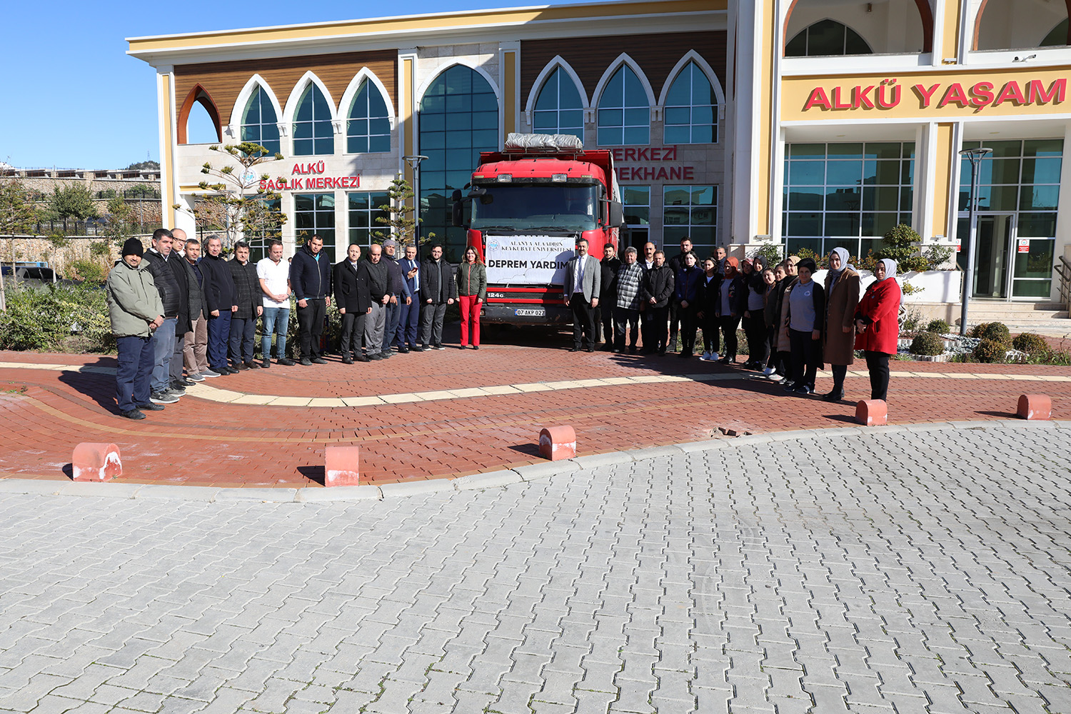 Alanya Alaaddin Keykubat Üniversitesi (ALKÜ) yaşanan deprem felaketi sonrasında toplanan yardım malzemelerini deprem bölgesine ulaştırılmak üzere yola çıktı. ALKÜ idari ve akademik personelinin depremzedelerin acılarını bir nebze olsun hafifletmek amacıyla teslim ettikleri çocuk pusedinden, mont, ayakkabı, battaniye, kadın/bebek hijyen malzemeleri, çocuk maması, yastık ve yorgana kadar, bulaşık deterjanından kilim, kazma/kürek, eldiven, döşek, el feneri, giysi ve kazaklara kadar 123 çeşit bir tır dolusu malzeme depremzedelere ulaştırılmak üzere hareket etti.