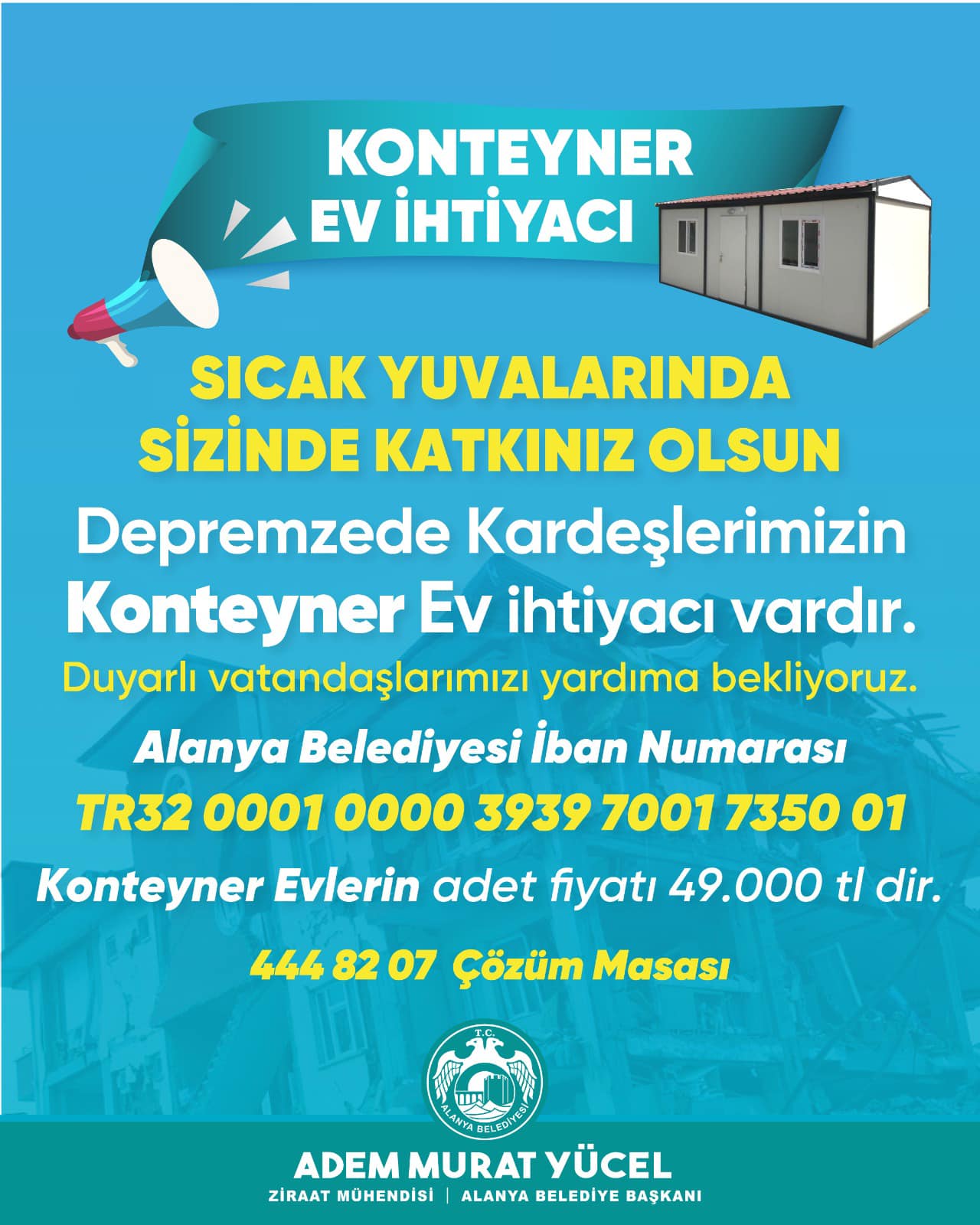 Alanya Belediye Başkanı Adem Murat Yücel, Alanya halkına sosyal medya hesabı üzerinden yaptığı çağrıda “Depremzede kardeşlerimizin konteyner ev ihtiyacı vardır. Duyarlı vatandaşlarımızı yardıma bekliyoruz” dedi...