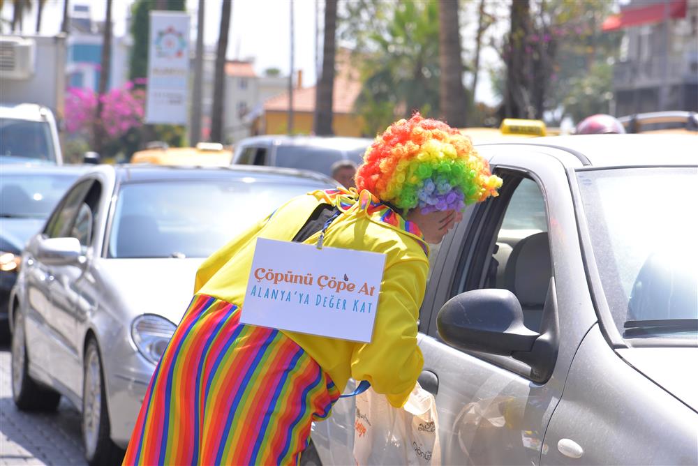 Alanya Belediyesi Temizlik İşleri Müdürlüğü, Alanya Belediye Başkanı Adem Murat Yücel’in talimatı ile çevre duyarlılığını arttırmak ve vatandaşların bilinçlendirilmesi için düzenlediği çalışmalar devam ediyor. Araçlardan yere atılan; izmarit, pet şişe, içecek kutusu, peçete gibi pek çok çöpün yollarda oluşturduğu kirliliği azaltmak için başlatılan proje tüm şehirde son hızıyla sürüyor. Çöpünü Çöpe At Alanya’ya Değer Kat sloganı ile başlatılan proje kapsamında Alanya’daki tüm kavşaklarda palyaço kostümleri ve afişlerle sürücüler uyarılıyor. Sürücülere tohuma dönüşen doğa dostu kurşun kalem, anahtarlık ve araç kokusu hediye eden ekipler sürücülere yere çöp atmamaları konusunda uyarılarda bulunuyorlar.