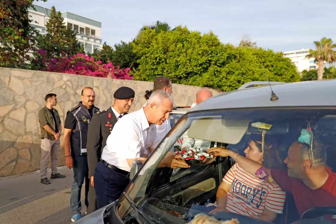 Alanya’nın doğu girişindeki denetim uygulama noktasına gelen araçlardaki vatandaşlara çikolata ikram eden Ürkmezer ve Özçelik, vatandaşların bayramını kutladı.