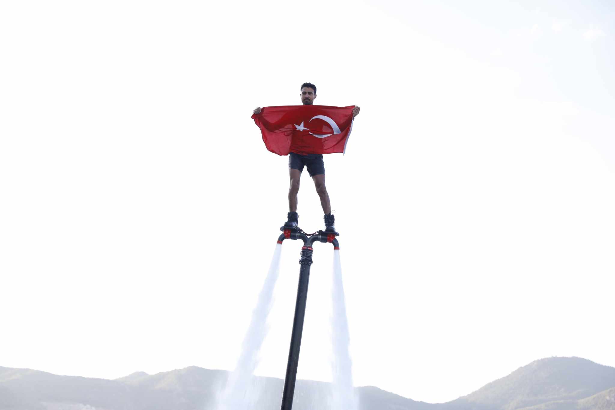 Kutlamalar kapsamında Alanya’yı dünyada temsil eden Furkan Yılmaz flyboard gösterisi gerçekleştirdi. Akrobatik hareketler ile izleyicilere unutulmaz bir gösteri sunan Yılmaz, açtığı Türk Bayrağı’nı da protokol üyelerine takdim etti. Son yılların moda spor olan Sub Board geçiş korteji de büyük ilgi görürken, dalgıçlar tarafından deniz altında açılan Türk Bayrağı da büyük alkış topladı.