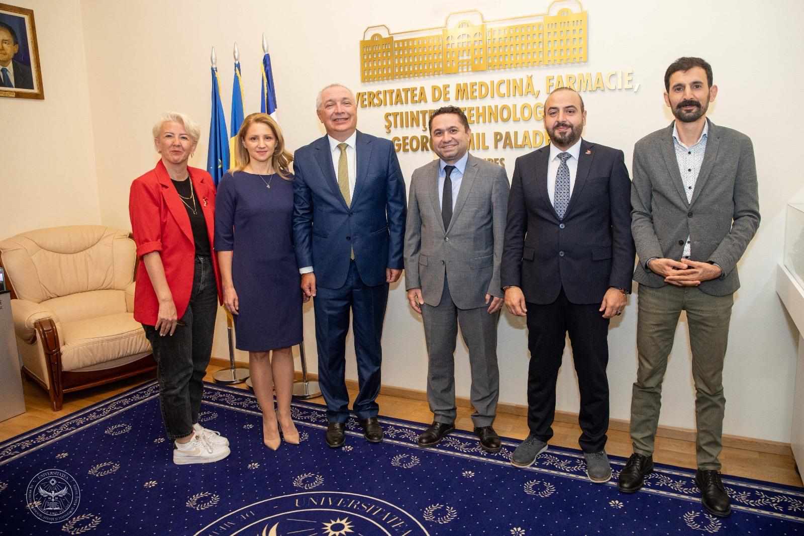Romanya'da heyeti; UMPhST Rektörü Prof. Dr. Leonard Azamfirei, Rektör Yardımcıları Prof. Dr.  Mihaela Kardos, Prof. Dr. Rodica Balasa, Assoc. Prof. Dr. Simona Muresan, Erasmus+ Koordinatörü Prof. Dr. Angela Borda ve UMPhST’nin tüm fakülte dekanları karşıladı.