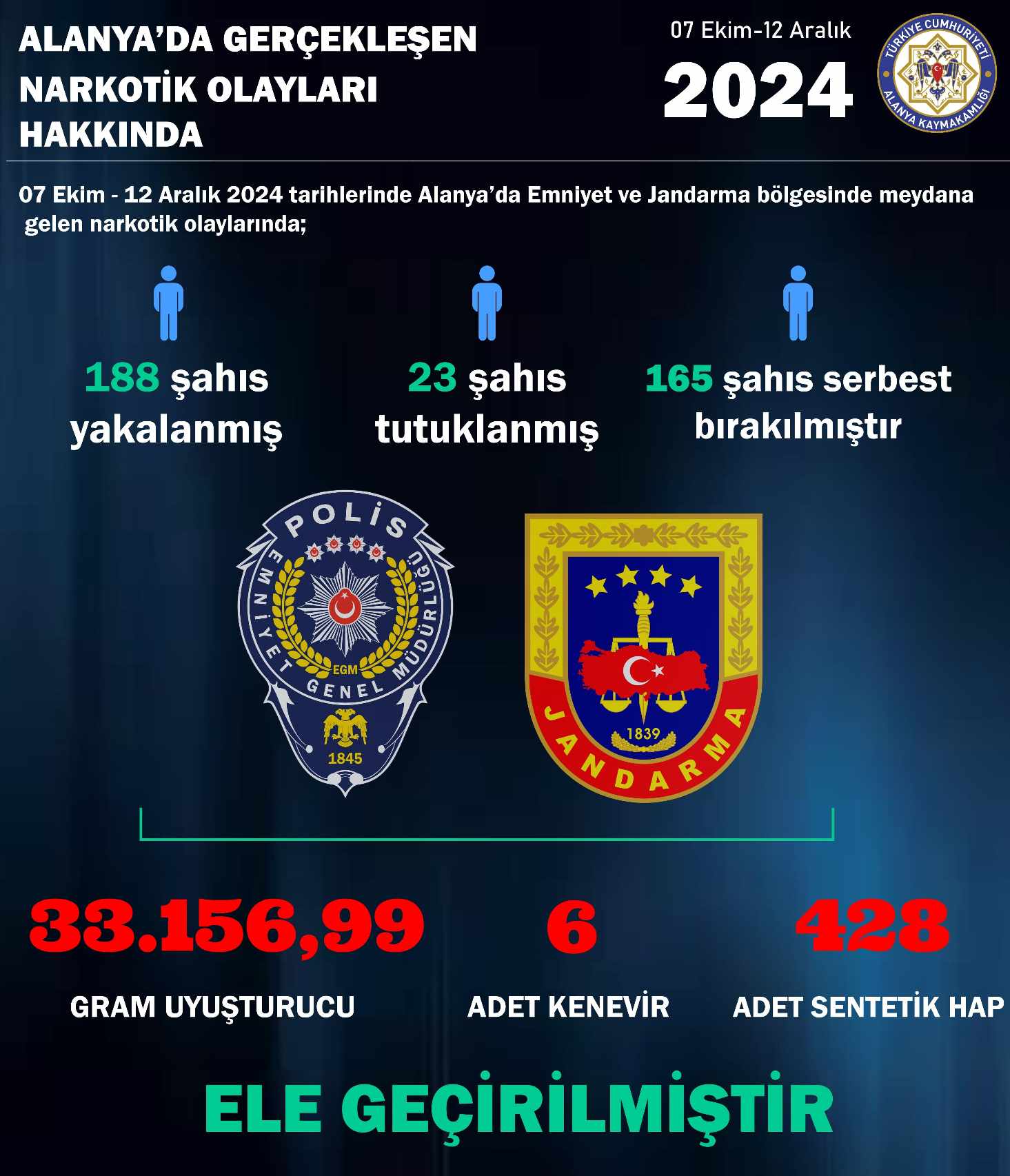 Alanya Kaymakamlığı, Alanya İlçe Emniyet Müdürlüğü ve İlçe Jandarma Komutanı tarafından 7 Ekim – 12 Aralık 2024 tarihleri arasında düzenlenen narkotik operasyonlarına ilişkin istatistiki veri yayınladı.
