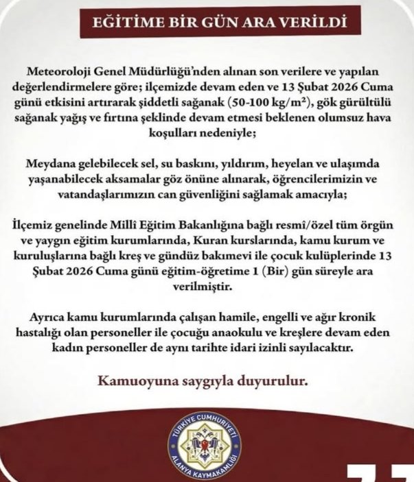 İlçemiz genelinde Millî Eğitim Bakanlığına bağlı resmî/özel tüm örgün ve yaygın eğitim kurumlarında, Kuran kurslarında, kamu kurum ve kuruluşlarına bağlı, rehebilitasyon merkezleri, kreş ve gündüz bakımevi ile çocuk kulüplerinde 13 Şubat 2026 Cuma günü eğitim-öğretime 1 (Bir) gün süreyle ara verilmiştir.
