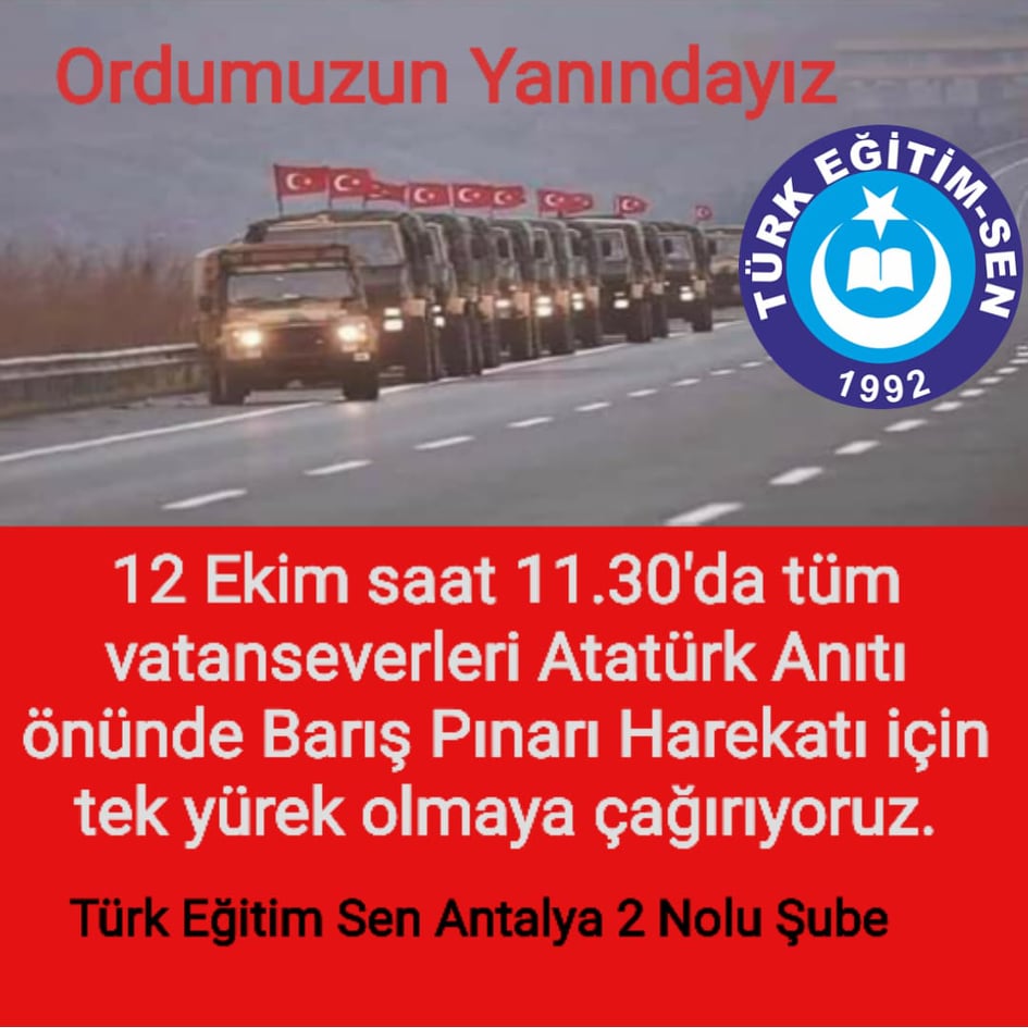 "ORDUMUZUN YANINDAYIZ sloganı ile 12 Ekim 2019 saat 11:30 da tüm vatanseverleri Atatürk Anıtı önünde Barış Pınarı Harekatı için tek yürek olmaya çağırıyoruz."denildi.