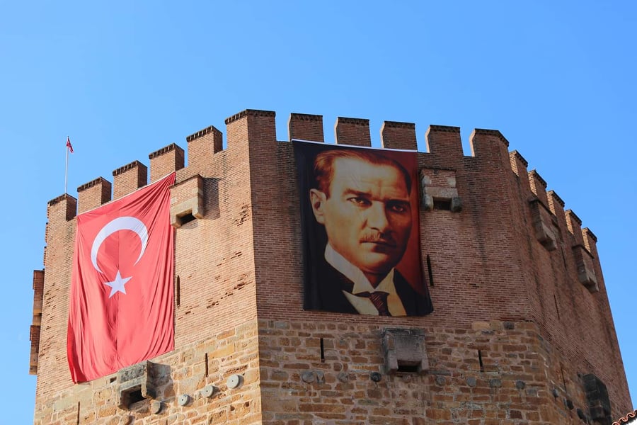 Kızılkule üzerine asılan dev Türk Bayrağı ve Mustafa Kemal Atatürk resmi katılımcıları gurulandırdı.