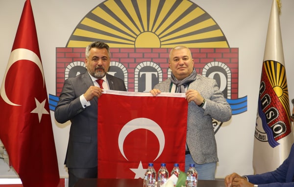Ziyaret sonunda ALSMO Başkanı Kerim Gökçeoğlu, Başkan Şahin’e Türk Bayrağı hediye ederken, Başkan Şahin nazik hediyesinden dolayı Gökçeoğlu’na teşekkür etti.