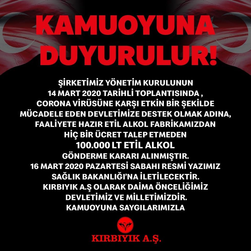 Şahin Kırbıyık’ın sahibi olduğu Kırbıyık A.Ş, aldığı yönetim kurulu kararıyla koronavirüsle mücadelede devlete destek olacaklarını duyurdu. Sosyal medya üzerinden yapılan duyuruda, “ Şirketimiz yönetim kurulunun 14 Mart 2020 tarihli toplantısında, koronavirüsüne karşı etkin bir şekilde mücadele eden devletimize destek olmak adına faaliyete hazır etil alkol fabrikamızdan hiçbir ücret talep etmeden 100 bin litre etil alkol gönderme kararı alınmıştır. 16 Mart Pazartesi günü resmi yazımız sağlık Bakanlığı’na iletilecektir. Kırbıyık A.Ş. olarak daima önceliğimiz devletimiz ve milletimizdir. Kamuoyuna saygılarımızla.” denildi.