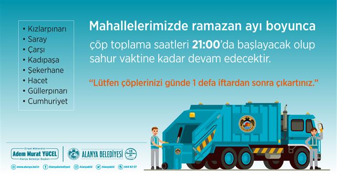 Alanya Belediyesi Temizlik İşleri Müdürlüğü, Ramazan ayı boyunca gerçekleşecek çöp toplama saatlerinde değişikliğe gitti. Yeni düzenleme ile Kızlarpınarı, Saray, Çarşı, Kadıpaşa, Şekerhane, Hacet, Güllerpınarı ve Cumhuriyet mahallelerinde 24 Nisan 2020 tarihinden itibaren saat 18.00’da başlayan çöp alım saatleri Ramazan ayı boyunca saat 21.00’da gerçekleşecek.