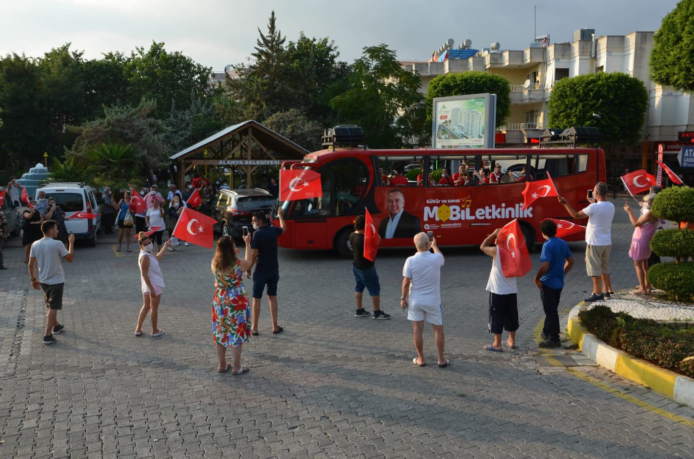 Mobil Etkinlik Otobüslerinden biri de Alanya’da konser verdi. Alanya’daki etkinlikte yerel sanatçılardan oluşan Cumhuriyet Bandosu sırasıyla, Avsallar Halk Pazarı, Konaklı Halk Pazarı, Mahmutlar Belediye önü, Alanya Atatürk Anıtı, Hacet Meydanı ve Damlataş Teleferik önünde halka canlı konser verdi. Ellerine bayraklarını alan 7’den 70’e herkes coşkuyla çalınan marşlara eşlik etti.