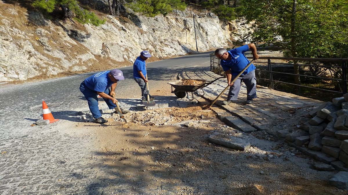 Antalya Büyükşehir Belediyesi Alanya’da arıza giderme çalışmaları sırasında bozulan parkeli alanlarda bakım ve onarım çalışması yapıyor.
