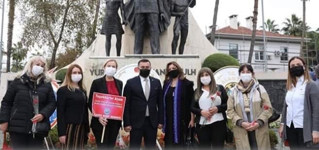 Özcan’ın konuşmasının ardından Başkan Yücel’in karanfil verdiği kadınlar anıt önünde toplu hatıra fotoğrafı çektirdi.