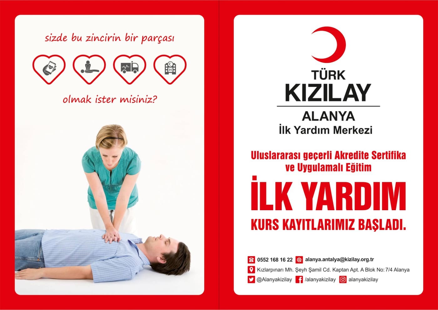 "Türk Kızılay Alanya Şubesi tarafından bir yıldır hizmete sunulan İlk yardım eğitim merkezi, uygulamalı ve dünya standartlarında, akredite eğitim vermektedir.