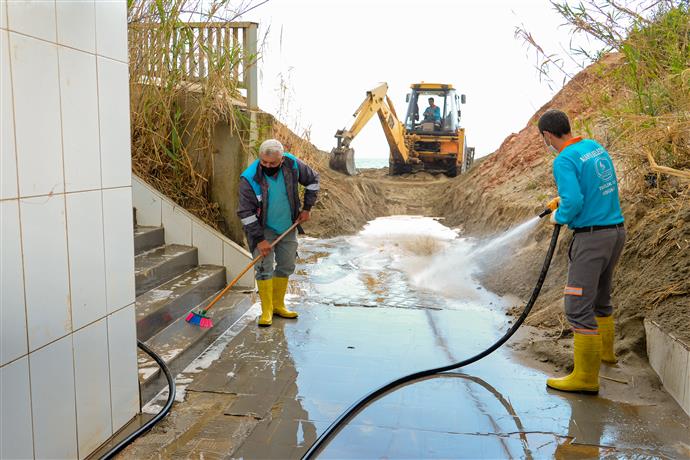 Alanya Belediyesi yaz sezonu öncesinde sahil bandındaki alt geçitlerin kum yığınlarıyla kapanan giriş-çıkışları ve sel suları ile oluşan balçıkları iş makineleri yardımıyla kaldırırken duvarlara verilen zararlar onarılarak boya işlemi görüyor. Alt geçitlerin güvenliği tek tek sağlanarak vatandaşların kullanımına açılıyor.