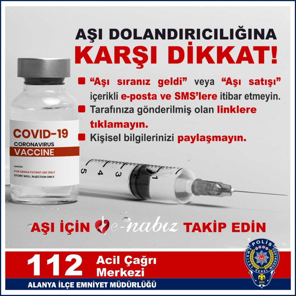 Alanya İlçe Emniyet Müdürlüğü, “Aşı sıranız geldi, aşı satışı içerikli e-posta ve SMS’lere itibar etmeyin” diyerek; dolandırıcılık yapanlara karşı vatandaşı uyardı...