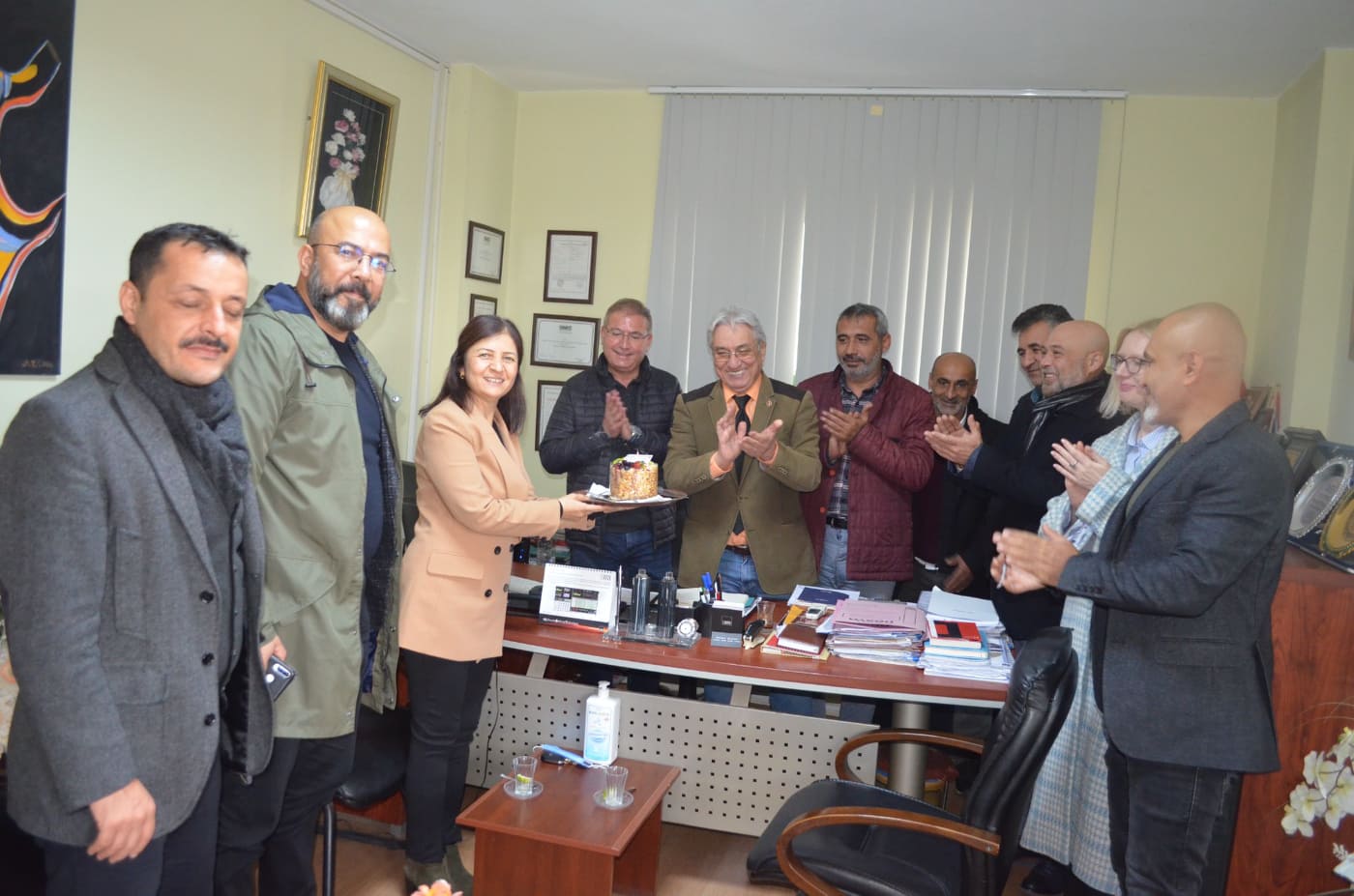 Kuruluş yıl dönümü nedeniyle pasta kesilmesinin ardından ziyaretçiler anı fotoğrafı çektirdi.