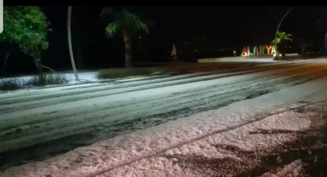 Alanya da gece yarısı ,yağmurun ardından yağan ve yaklaşık 20 dakika süren yoğun dolu yağışı sonrası her taraf beyaza büründü.Yolda dolu yoğunluğundan dolayı araç sürücüleri kayganlaşan yolda zor anlar yaşadı.
