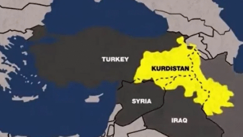 Teröristbaşı Abdullah Öcalan’ın resimlerini taşıyan PKK yandaşlarına ait görüntülerin kullanıldığı haberde, Türkiye topraklarının bir kısmın Kürdistan olarak gösterildi.