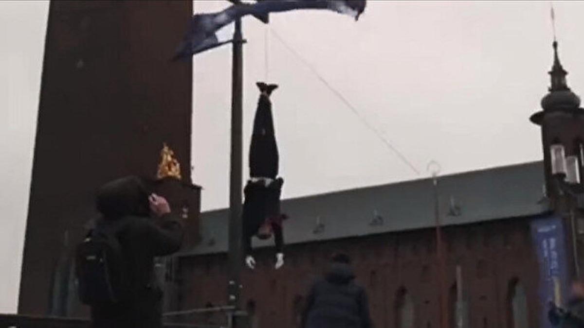 Başkent Stockholm'de tarihi belediye binası önünde toplanan bir grup terör örgütü PKK/YPG destekçisi, Cumhurbaşkanı Recep Tayyip Erdoğan'a benzetilen bir kuklayı binanın önündeki direğe ayaklarından astı ve bu anın görüntüsünü sosyal medyadan paylaştı.