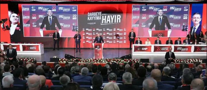 CHP'nin 22. Olağanüstü Kurultayı "Darbeye ve Kayyuma Hayır" sloganıyla Ankara'da yapıldı. Özgür Özel salona CHP'nin eski genel başkanları Hikmet Çetin ve Murat Karayalçın'la geldi. Ayrıca Muharrem İnce ile Mansur Yavaş da Özel'in hemen yanında yer aldı. Kemal Kılıçdaroğlu katılmadı, Gürsel Tekin ise davet edilmedi. Özgür Özel "Güven Oylaması" yapılabilmesi için üyelerden "Güvensizlik" oyu vermelerini istedi. Böylece yönetim düştü ve tekrar seçime gidildi, oyların tamamını Özgür Özel aldı...