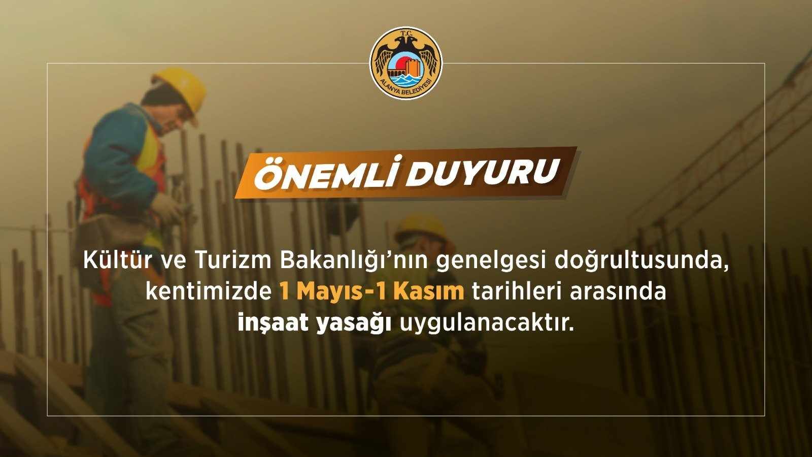 Alanya Belediyesi’nden konuyla ilgili yapılan açıklamada 1 Mayıs itibariyle inşaat faaliyetlerinin sonlandırılması gerektiği belirtildi. Sektör temsilcilerinin söz konusu takvime göre planlama yapmaları istenirken, yasağa uymayan işletmelere gerekli cezai işlemlerin uygulanacağı belirtildi.