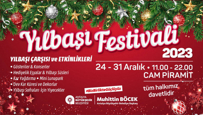 Antalya Büyükşehir Belediyesi, 24-31 Aralık 2022 tarihleri arasında Cam Piramit’te Yılbaşı Festivali düzenliyor. Festivalde yılbaşı çarşısı ve birbirinden renkli etkinlikler Antalyalılarla buluşacak...