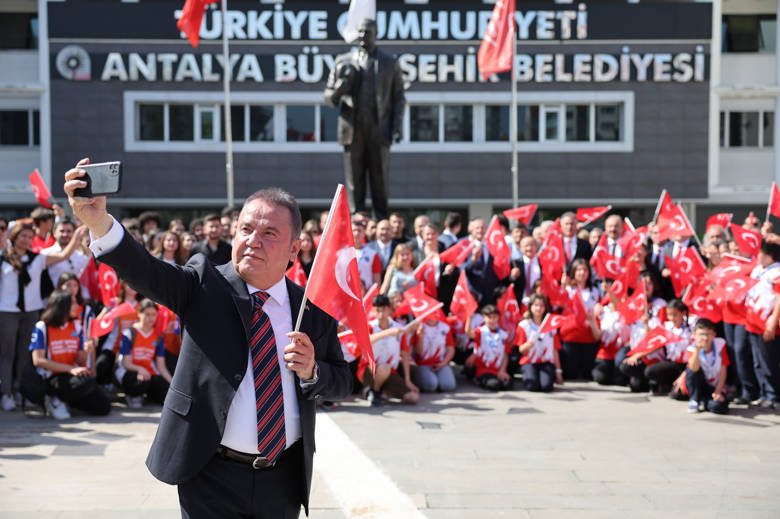 Büyükşehir İzcileri katıldı. Tören, Cumhuriyetin kurucusu Gazi Mustafa Kemal Atatürk’ün Anıtına Çelenk sunulmasıyla başladı. Saygı duruşunun ardından Antalya Büyükşehir Belediye Bandosu (ABBO) eşliğinde İstiklal Marşı okundu. Başkan Böcek, çelenk töreninin ardından bandonun çaldığı marşları gençlerle birlikte söyleyerek Türk Bayrağını dalgalandırdı.