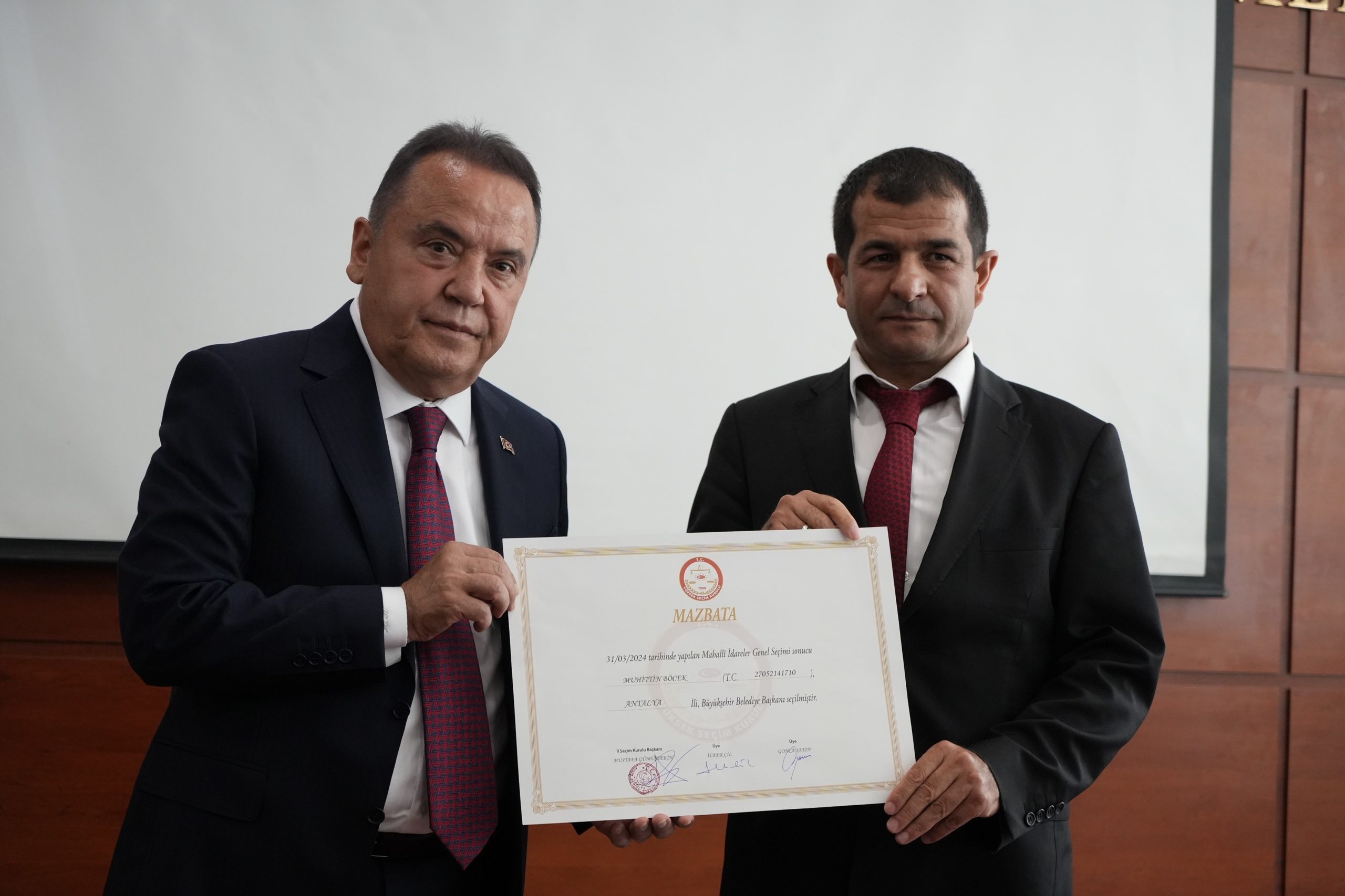 31 Mart 2024 yerel seçimlerinde yeniden Antalya Büyükşehir Belediye Başkanı seçilen Muhittin Böcek, mazbatasını Antalya İl Seçim Kurulu Başkanı Mustafa Gümüştekin’in elinden aldı...