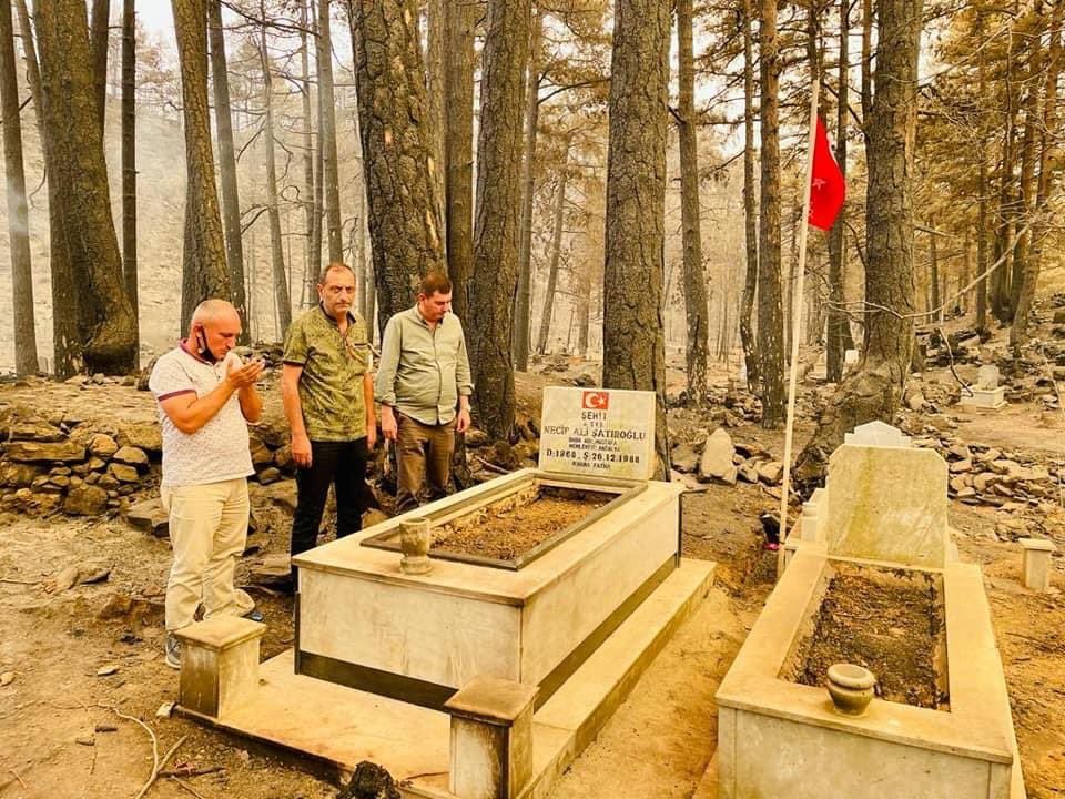 MHP--Milliyetçi Hareket Partisi Alanya İlçe Başkanı Mustafa Türkdoğan, sosyal medya hesabından yaptığı paylaşımda, " Güzelbağ Mahallemizde komple yanan mezarlıkta medfun Şehidimiz Necip Ali Şatıroğlu’nun mezarı ve başucundaki Türkiye Bayrağı şanlı bayrağımız zarar görmemiş, hikmetinden sual olunmaz Allah’ım" ifadelerini kullandı.