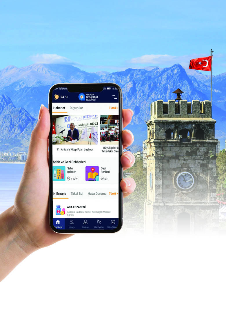 Her yıl ağırladığı yerli ve yabancı misafirler ile dünyanın gözdesi olan Antalya, artık cebinize sığacak. Antalya Büyükşehir Belediyesi Bilgi İşlem Dairesi Başkanlığı tarafından hayata geçirilen “Antalya Mobil” uygulamasıyla hayat kolaylaşıyor. Ücretsiz indirilen uygulamayla vatandaşlar, Antalya Büyükşehir Belediyesi’nin resmi internet sitesinde yer alan haberler, etkinlikler, ulaşım ve duyuruları görebildiği gibi borç sorgulama, borç ödeme, satın alma takibi gibi işlemler yapılabiliyor.