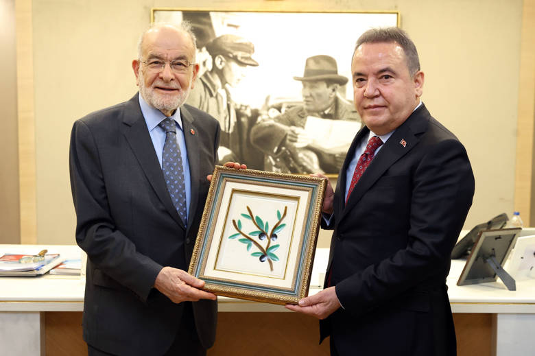 Saadet Partisi Genel Başkanı Temel Karamollaoğlu ziyaretin sonunda Başkan Böcek’e zeytin dalı tablosu ve kitap hediye etti. Başkan Böcek de Karamollaoğlu’na Döşemealtı halısı takdim etti.