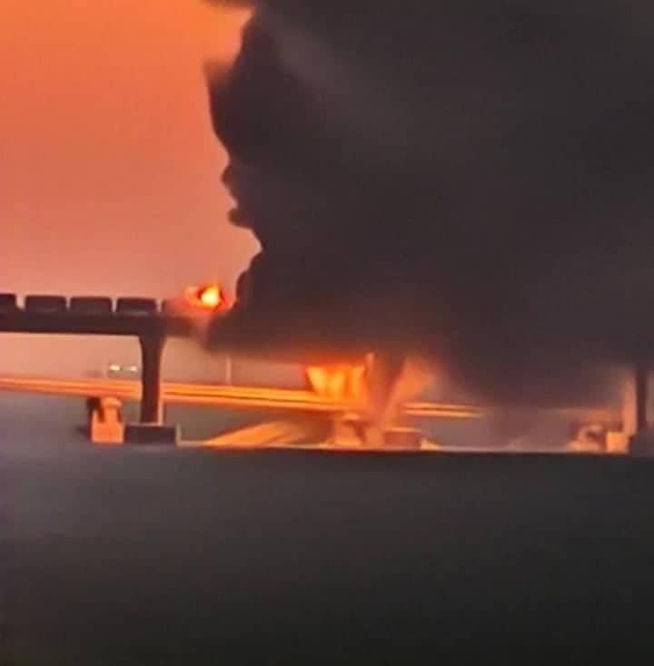 Ведомство информирует, что в результате подрыва грузового автомобиля на мосту загорелись семь топливных цистерн и частично обрушились два пролёта.