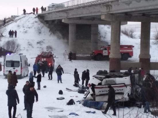 В Забайкальском крае в воскресенье пассажирский автобус упал с десятиметрового моста в замерзшую реку Куэнга и перевернулся. Из-за падения на лед у автобуса проломило крышу, и люди оказались заблокированы внутри. Поставить автобус на колеса удалось только через несколько часов. По последним данным, в аварии погибли 19 человек, в числе которых два ребенка. Всего в автобусе было 43 пассажира и водитель. Официальная версия произошедшего