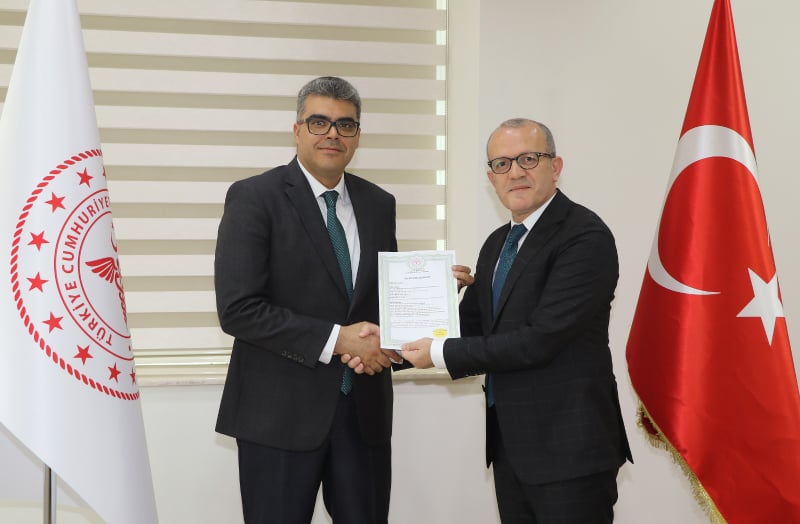 İl Sağlık Müdürü Dr. Hülür ziyaret sonunda, kesin kabulü tamamlanan ALKÜ Alanya Eğitim ve Araştırma Hastanesi’nin geçici ruhsat belgesini Prof. Dr. Hüseyin Lakadamyalı’ya takdim etti.
