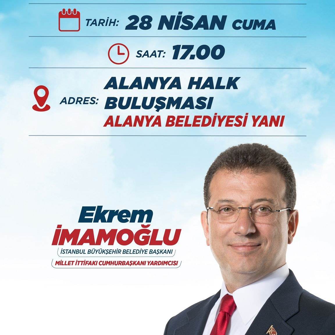 İstanbul Büyükşehir Belediyesi Başkanı ve 13. Cumhurbaşkanı adayı yardımcısı Ekrem İmamoğlu 28 Nisan'da Alanya'ya geliyor...