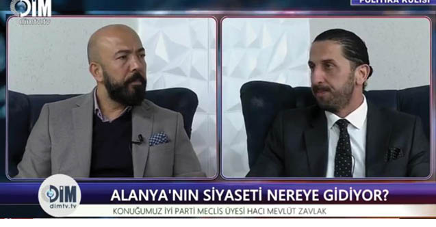 DİM TV (dimtv.tv) ekranlarında izleyicisiyle buluşan Politika Kulisi’nin canlı yayın konuğu Alanya Belediyesi’nin İyi Parti’li Meclis Üyesi Hacı Mevlüt Zavlak oldu. Zavlak, Dim TV (dimtv.tv) Genel Yayın Yönetmeni Alper Kutay’ın sorularını yanıtladı. İzlenme rekorları kıran programda Alanya ve Antalya siyaseti konuşuldu. Zavlak sürece ve gündeme ilişkin çarpıcı açıklamalarda bulundu. Programın öne çıkan satır başları ise şu şekilde oldu: