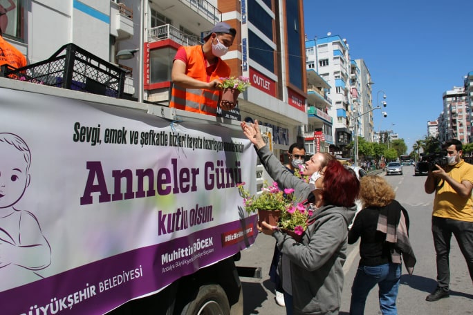 Antalya Büyükşehir Belediyesi, Anneler Günü’nde Antalya’nın dört bir yanında yüz binlerce çiçek dağıttı. Koronavirüs salgını nedeniyle zor günler geçiren çiçek üreticilerinden alınan karanfil ve saksı çiçekleri Büyükşehir Belediyesi personeli tarafından annelere hediye edildi. Çiçeklerini alan anneler bu özel günde kendilerini unutmayan Başkan Muhittin Böcek’e teşekkür etti...