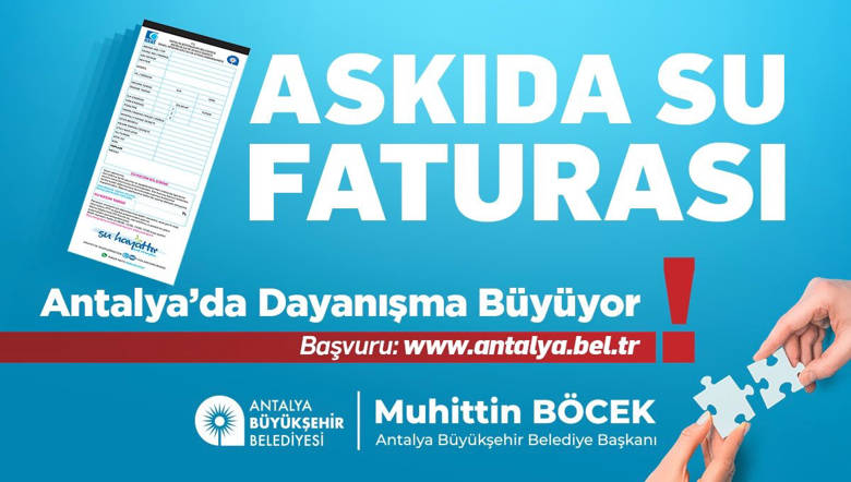Antalya Büyükşehir Belediye Başkanı Muhittin Böcek’in, dünyayı etkisi altına alan Covid-19 salgını nedeniyle ekonomik sıkıntı yaşayan vatandaşlar için geçtiğimiz yıl “Biz birlikte güçlüyüz” diyerek başlattığı “Askıda Fatura” uygulaması paylaşma ve dayanışmanın simgesi Ramazan ayında da devam ediyor. Pandemi ve tam kapanma ile birlikte su faturalarını ödemede güçlük çeken ihtiyaç sahipleri Antalya Büyükşehir Belediyesi’nin resmi internet sitesi antalya.bel.tr adresine giriş yaparak Askıda Fatura uygulamasından yararlanabiliyor. Uygulama, aylık su faturalarını ödemekte zorlanan ihtiyaç sahipleriyle, bu ihtiyaçları onlar adına gidermek isteyen hayırsever vatandaşları buluşturuyor. Büyükşehir Belediyesi’, Ramazan ayında sosyal yardımlarla başlattığı dayanışma ağını Askıda Fatura ile büyütürken,  Antalyalılar veren elin alan eli görmediği bir anlayışla yardımlaşabiliyor.