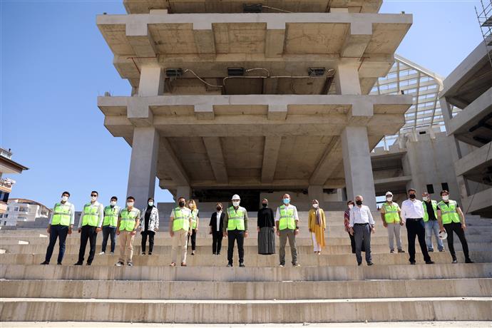 Alanya Belediyesi yeni hizmet binasında çalışmalar tüm hızıyla sürüyor. Alanya Belediye Başkanı Adem Murat Yücel, şantiye sahasını ziyaret ederek binanın son halini yerinde inceledi ve çalışmalar hakkında bilgi aldı. Başkan Yücel’e icracı müdürlüklerden sorumlu Başkan Yardımcısı Özgür Karamut, Başkan Yardımcısı Abdullah Akbaş, Kentsel Tasarım Müdürü Sibel Ademoğlu, teknik ekibi ve yüklenici firma yetkilileri eşlik etti.