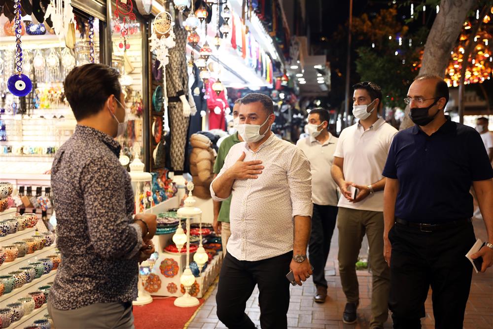 Alanya Belediye Başkanı Adem Murat Yücel, 1 Temmuz’da açıklanan normalleşme kararının ardından saat sınırlaması kalkan esnafları ziyaret etti.