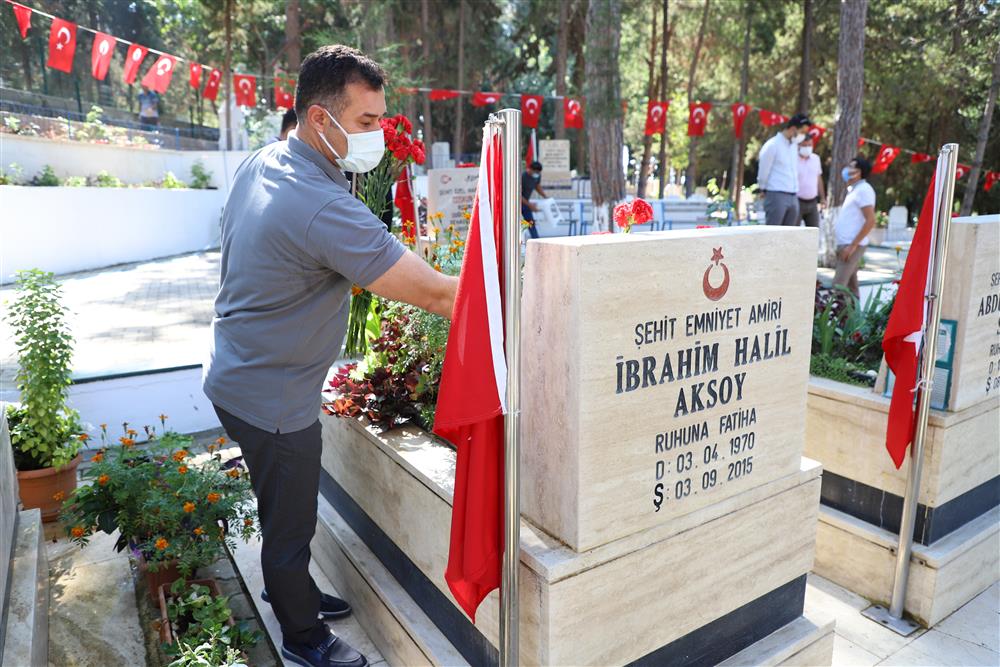 Başkan Yücel, şehitler için dua edip, çicek dikti. Başkan Yücel, kabir ziyareti yapan vatandaşlara da çiçek dağıtıp, onlarla sohbet etti...
