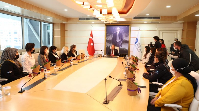 Büyükşehir Belediye Başkanı Muhittin Böcek, belediyedeki kadın çalışanların 8 Mart Dünya Emekçi Kadınlar Günü’nü kutladı. Kadın çalışanlarla bir araya gelen Başkan Böcek, onlara çiçek hediye ederek, sohbet etti. Planlı, kurallı, kimlikli bir kent için gerçekleştirdikleri hizmetleri belediyenin kadın personellinin büyük katkısı ve gayretiyle hayata geçirdiklerini belirten Başkan Böcek, emekleri için kadın çalışanlara teşekkür etti. Kadınlara her alanda pozitif ayrımcılık yapmaya çalıştıklarını anlatan Başkan Böcek, Büyükşehir Belediyesi’ndeki kadın çalışanların bu özel günde idari izinli sayılacağını söyledi.